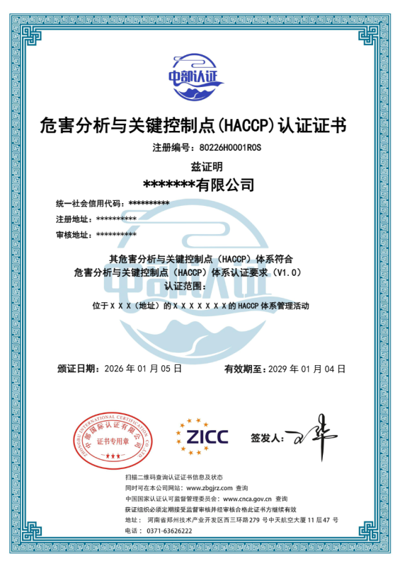 危害分析与关键控制点(HACCP)认证证书