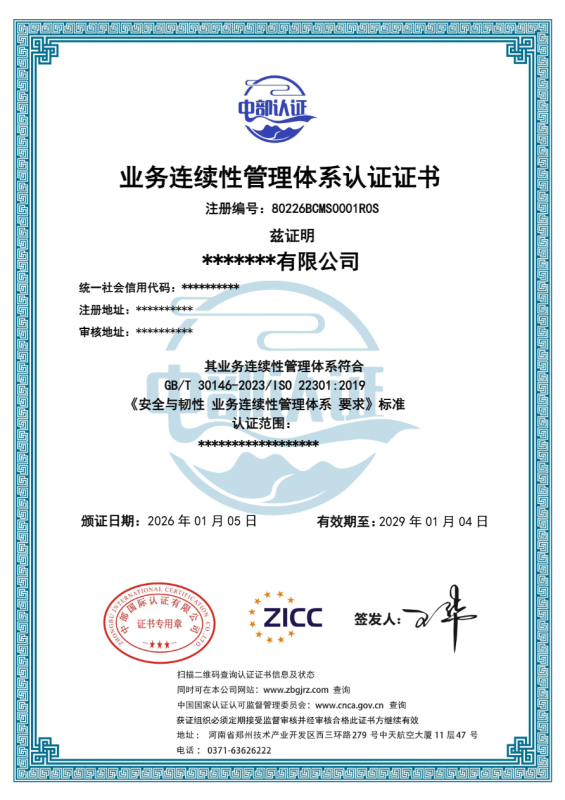 业务连续性管理体系认证证书