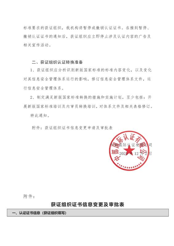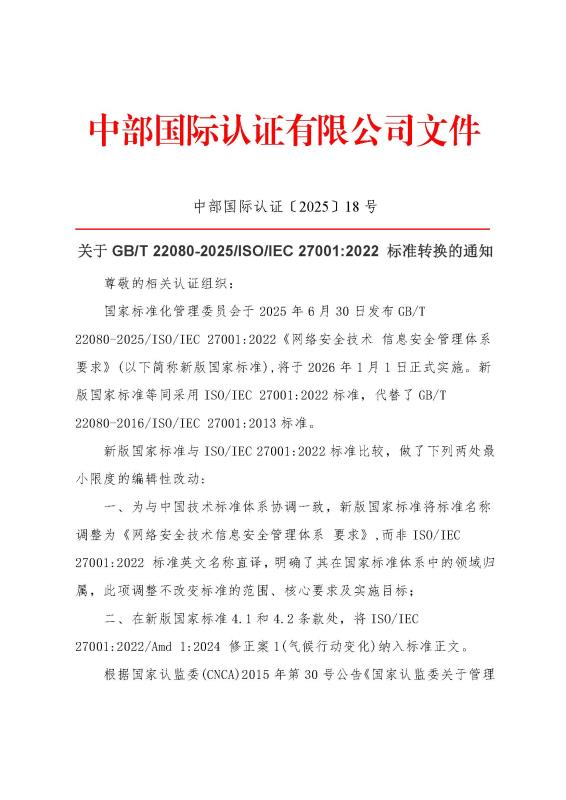 关于GB/T 22080-2025/ISO/IEC 27001:2022 标准转换的通知