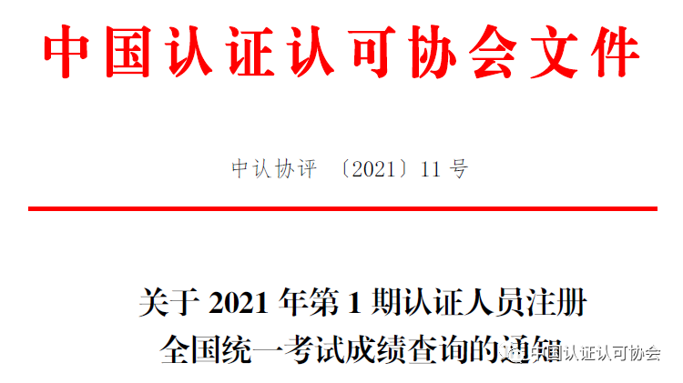 7月6日起,考生可通过中国认证认可协会微信公众号查询2021年第1期认证人员注册全国统一考试成绩,查询期为3个月。