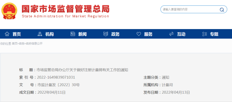 《注册计量师注册管理规定》(市场监管总局公告2022年第6号,以下简称《规定》)将于2022年5月1日起施行。为确保《规定》顺利实施,现就做好注册计量师注册工作有关事项通知如下: